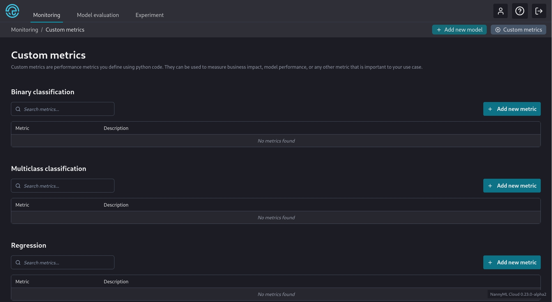 There are three types of custom metrics supported. Binary Classification, Multiclass Classification, and Regression. They are organized separately on the Custom Metrics settings page shown below: