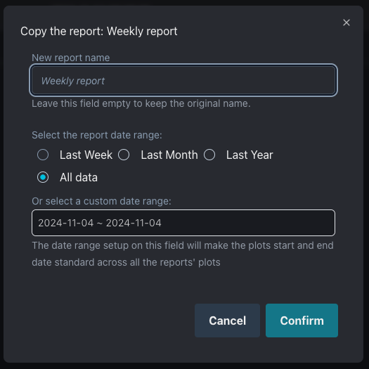 Copy feature is useful for re-using plots and explanations from one existing report. When the Copy button is clicked, the user is presented to a modal similar to the Create new report button, except the template selection.