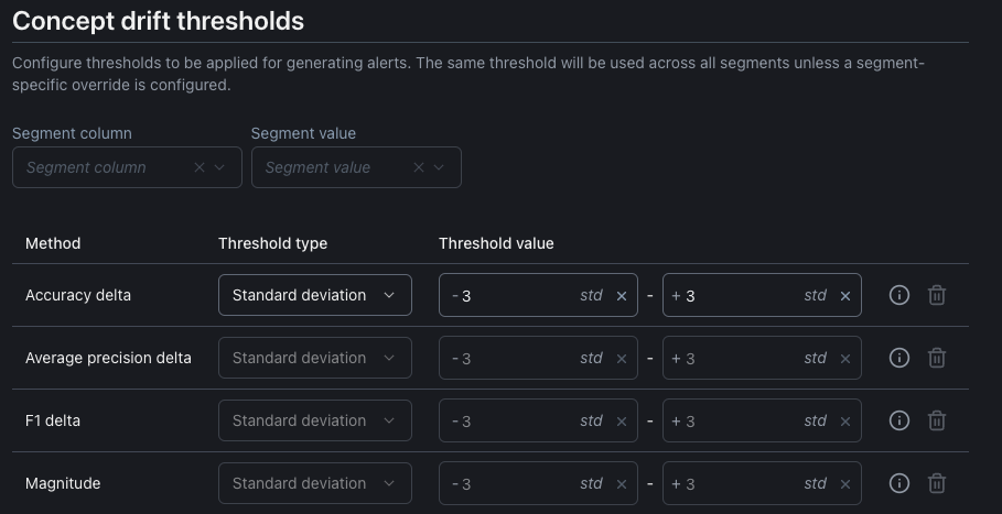 Each enabled metric allows you to set up a threshold for generating alerts for that metric. By default, the thresholds are applied across all segments unless specified otherwise.