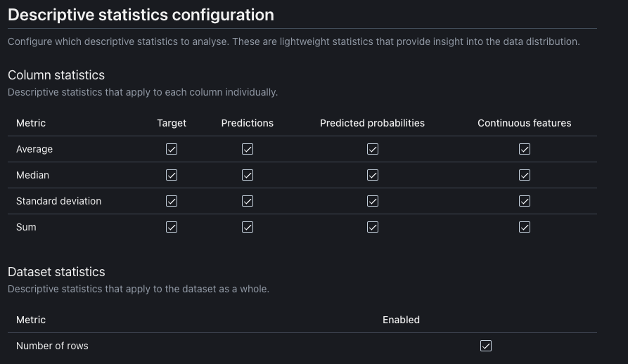 Here you can set up which descriptive statistics to analise. These are lightweight statistics that provide insight into the data distribution.