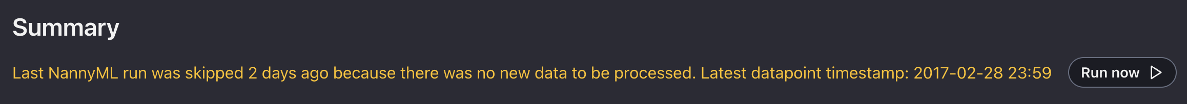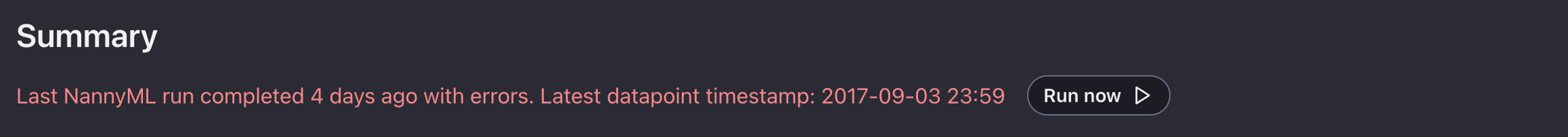 The first tab you can access in the side panel is the model summary page. It displays monitoring results for the most recent chunk for performance, concept shift, covariate shift, and data quality checks and notifies you whether there are any alerts.
