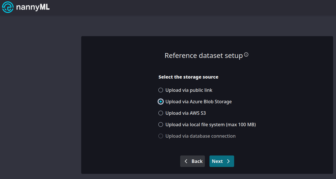 1. Set up a new model in NannyML Cloud. Select the **Upload via Azure Blob Storage** option.<br>