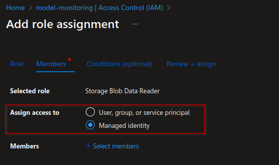 5. Now you'll select the member to assign the role to. In this case you'll assign it to a **managed identity**, so select that option. Then hit the **+ Select members** link to open up the search pane.\ <br>