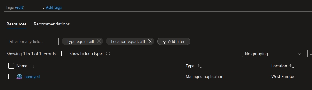 Resources page with our instance. Click the managed application to see its overview page and details.