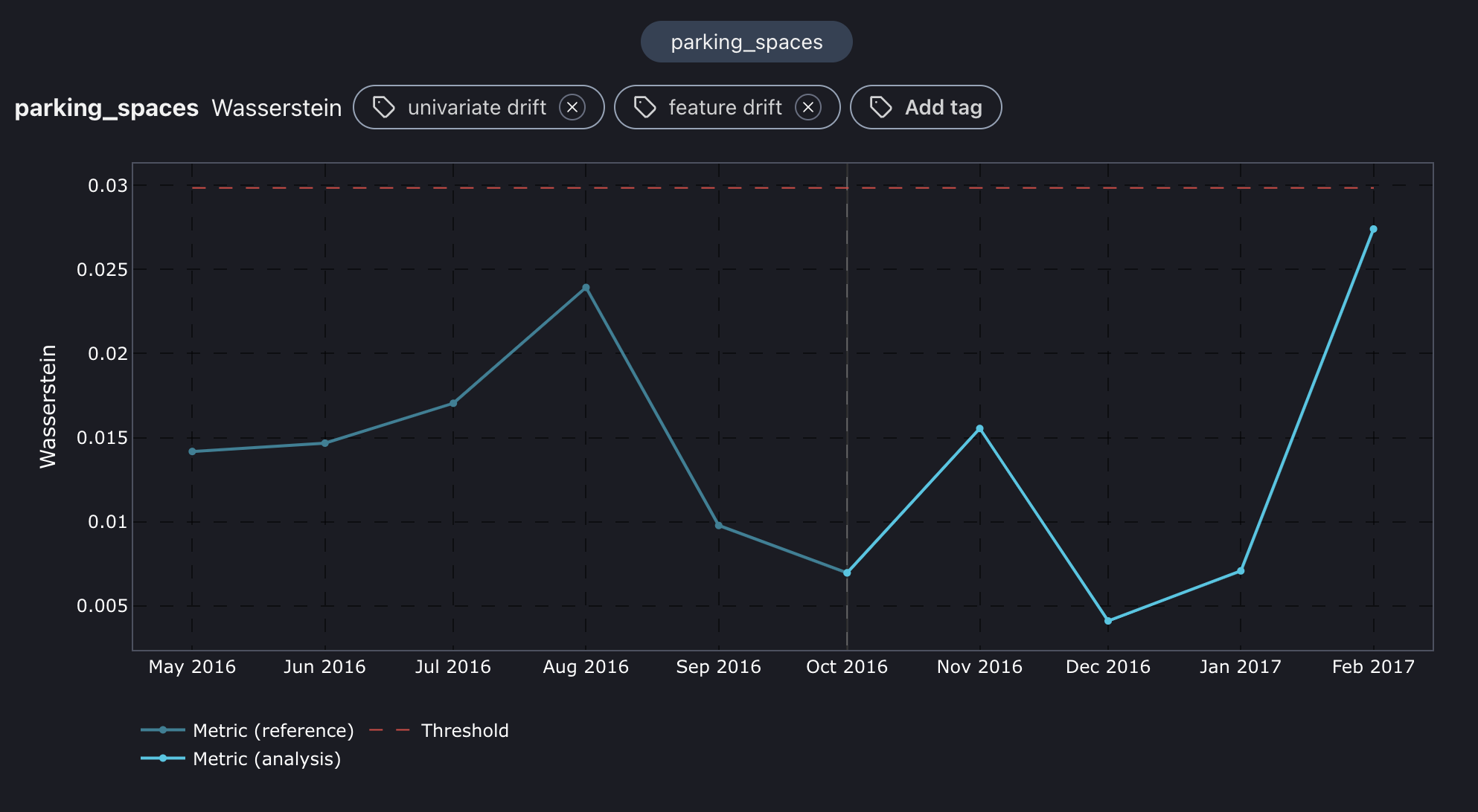 <figure><img src="https://content.gitbook.com/content/vipr4qR9MrP243sDPhAQ/blobs/jjcwC7bPpugwadLhgphe/quickstart_parking_spaces.png" alt=""><figcaption><p>Wasserstein distance plot for parking_spaces feature. </p></figcaption></figure>