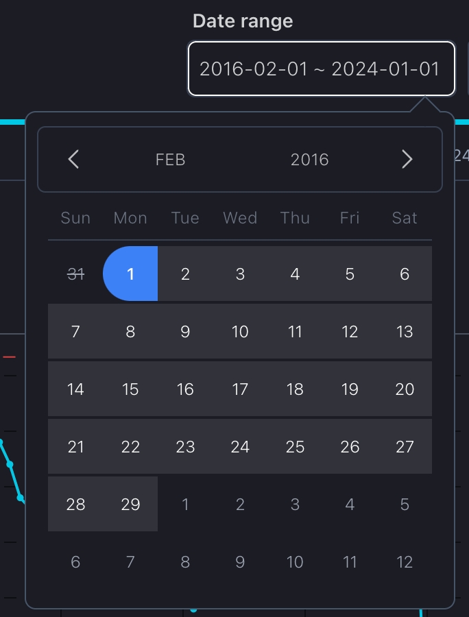 To reset a previously set date period, whether using the date range or slider, simply press the "Reset" button.