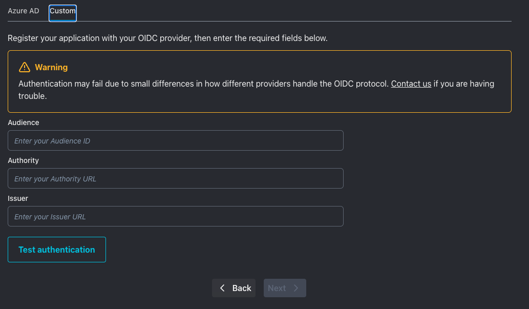 <figure><img src="https://content.gitbook.com/content/cgDbLHPAHMe3kHJeobtk/blobs/9E5KabEilpAarWigx18g/Screenshot%202024-07-08%20at%2016.43.55.png" alt=""><figcaption><p>Custom OIDC option</p></figcaption></figure>