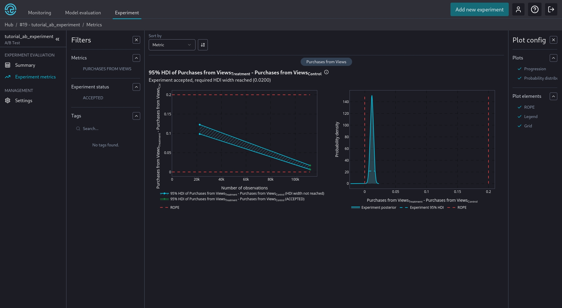 On the left, we see the evolution of the 95% HDI of the differences of the posteriors of the experiment metric as we add more observations. The limits of the ROPE are shown as horizontal red dashed lines. The HDI is colored differently according to the status of the experiment. It starts with light blue color and will stay so until the required 95% HDI width is reached. After the required 95% HDI width is reached it will again stay light blue until the 95% HDI width is either fully inside or fully outside the ROPE region. If it is fully outside it will become red colored and the experiment will be rejected. If it is fully inside it will become green and the experiment will be accepted. The fill between the lines showing the edge of the 95% HDI is also governed by the status the experiment had on the previous point. (This is why the fill on the image above is light blue but the status of the experiment at the end of the points is green - accepted.)