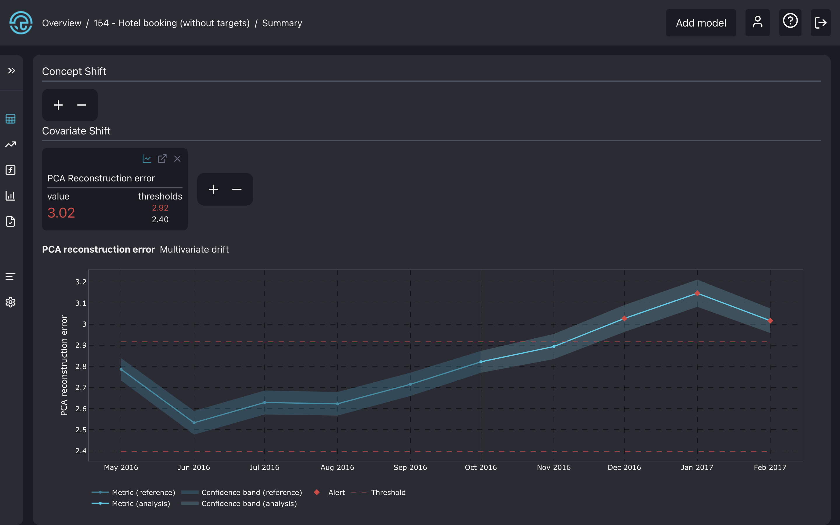 Also, the PCA reconstruction error from the multivariate drift detection method seems to be higher than the given thresholds.