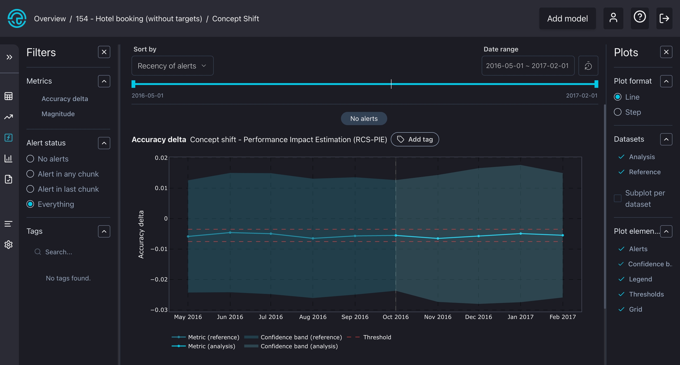 The graph illustrates the impact of concept drift on performance, with the x-axis representing the change in accuracy due to concept drift. As we can see, it's less than -0.01 and remains within the specified thresholds, not triggering any alerts. This suggests that concept drift did not contribute to a drop in accuracy during that period, only previously analyzed covariate shift!