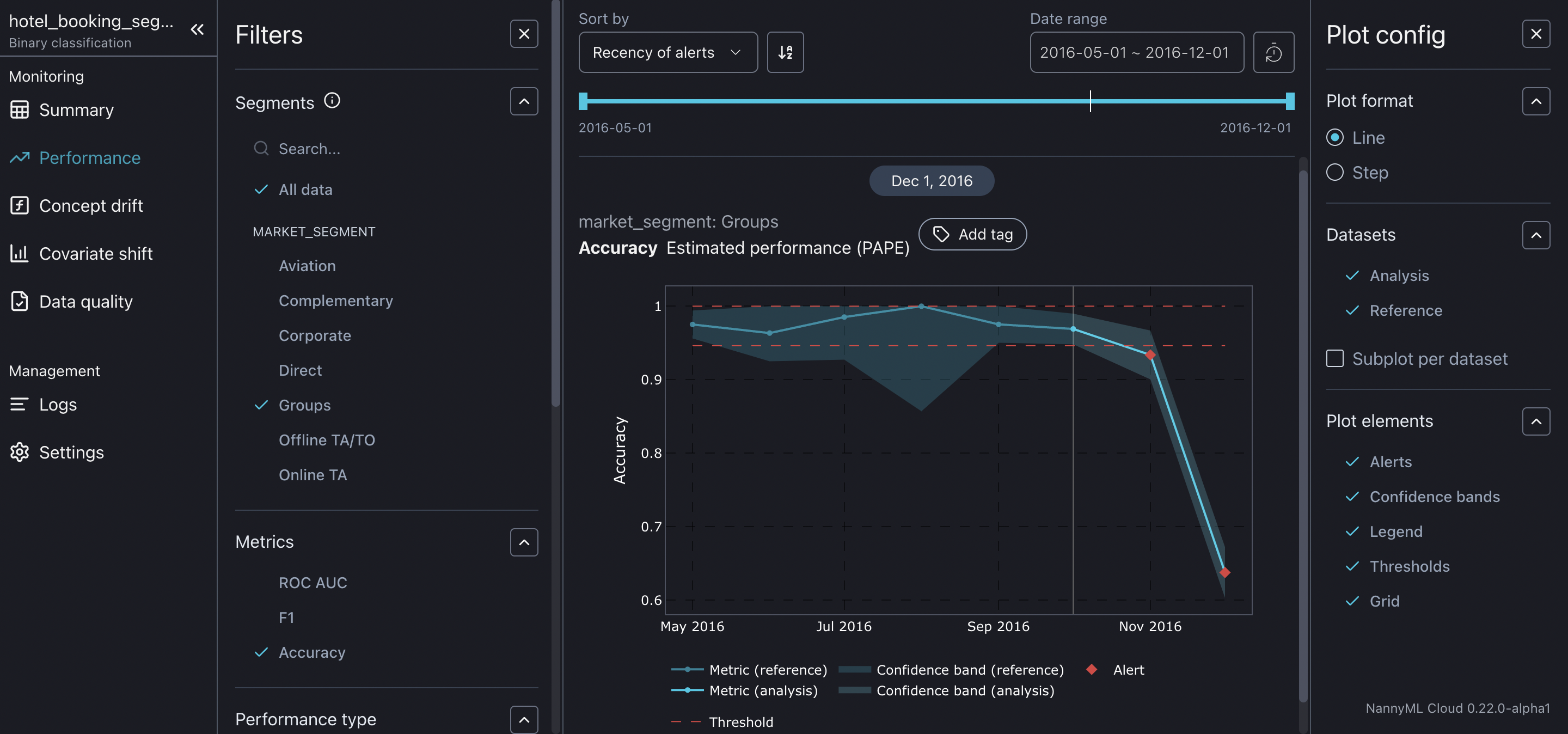 One of the features used in the model predicting hotel booking cancellations is "market\_segment". The values this feature can assume include Groups, Direct, and Corporate. We will focus on analyzing the Groups segment, as a broader analysis showed this segment to be a potential reason for a drop in model performance. This means analyzing the subset of the entire dataset where maktet\_segment is Groups. When monitoring expected performance using [PAPE](https://docs.nannyml.com/cloud/~/changes/iYzE2wezHZA0sySWS4Ei/model-monitoring/how-it-works/probabilistic-adaptive-performance-estimation-pape), we observe that the model is expected to perform well on the entire dataset, while the expected performance of the segment where market\_segment is Groups falls below the preset threshold for performance.