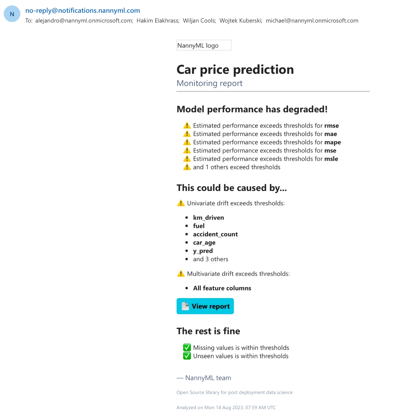Suppose there are any significant alerts on the last chunk. In that case, NannyML will send an automated email to your email account with some of the main insights: the performance metrics that have dropped and the potential causes of it.