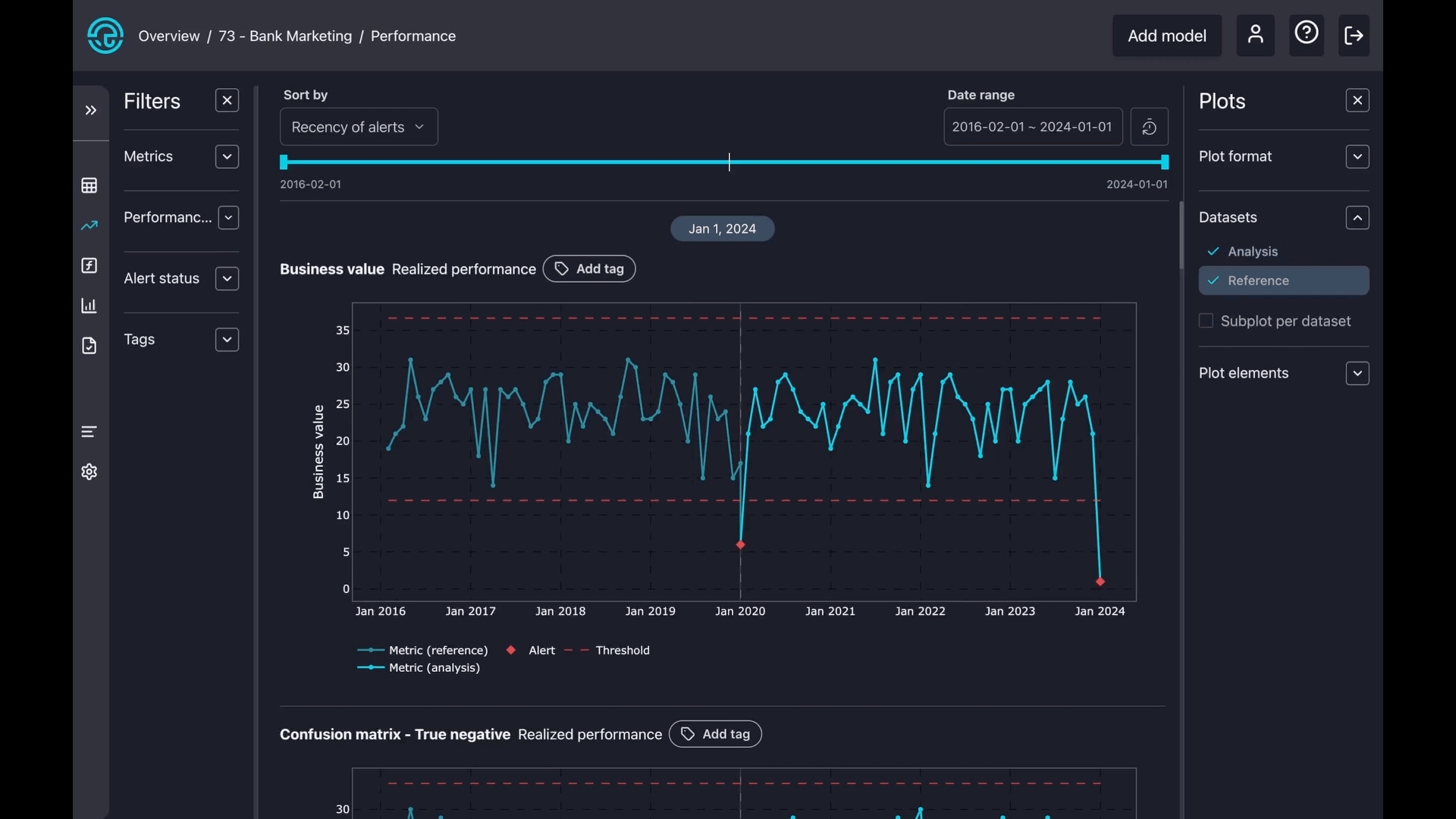 The charts are interactive; you can hover over them for more details. Red squares signal alerts, and the blue line represents the metric in the reference period. The light blue line indicates the metric during the analysis period.