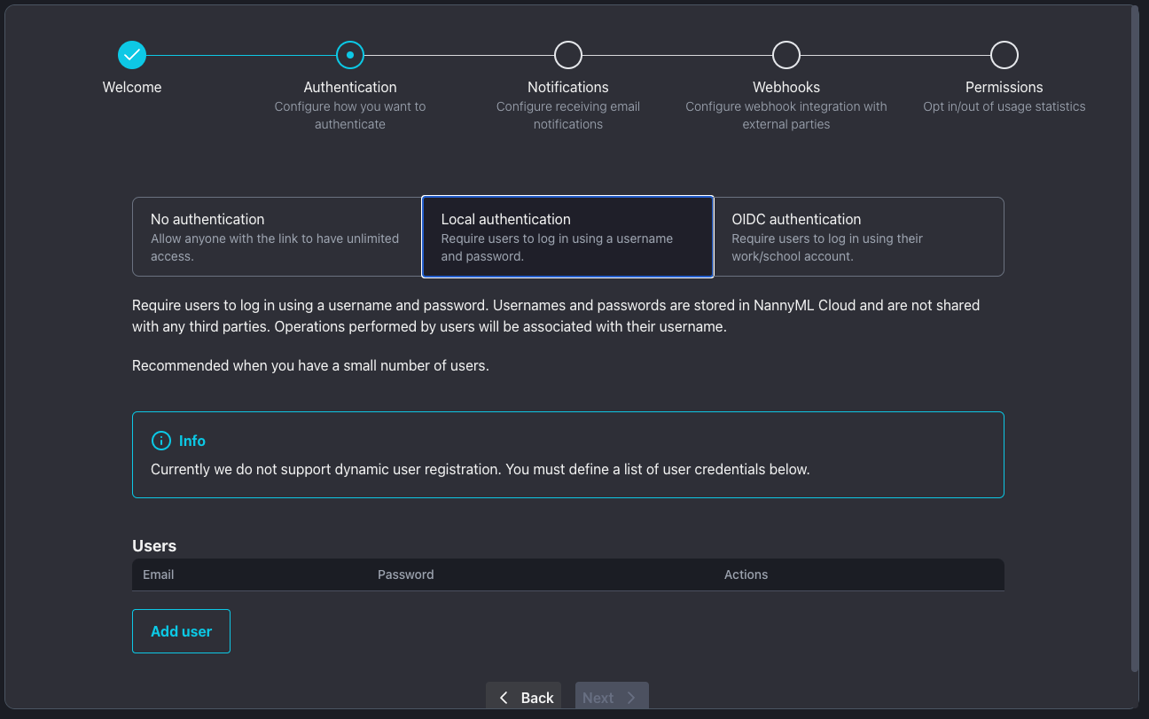 By choosing local authentication you can define a list of users who can access NannyML cloud. Each user requires an email, and a password. After creating a user, it is possible to delete them, but it is not possible to update the user information. This means updating the user password requires deleting and re-creating the user.