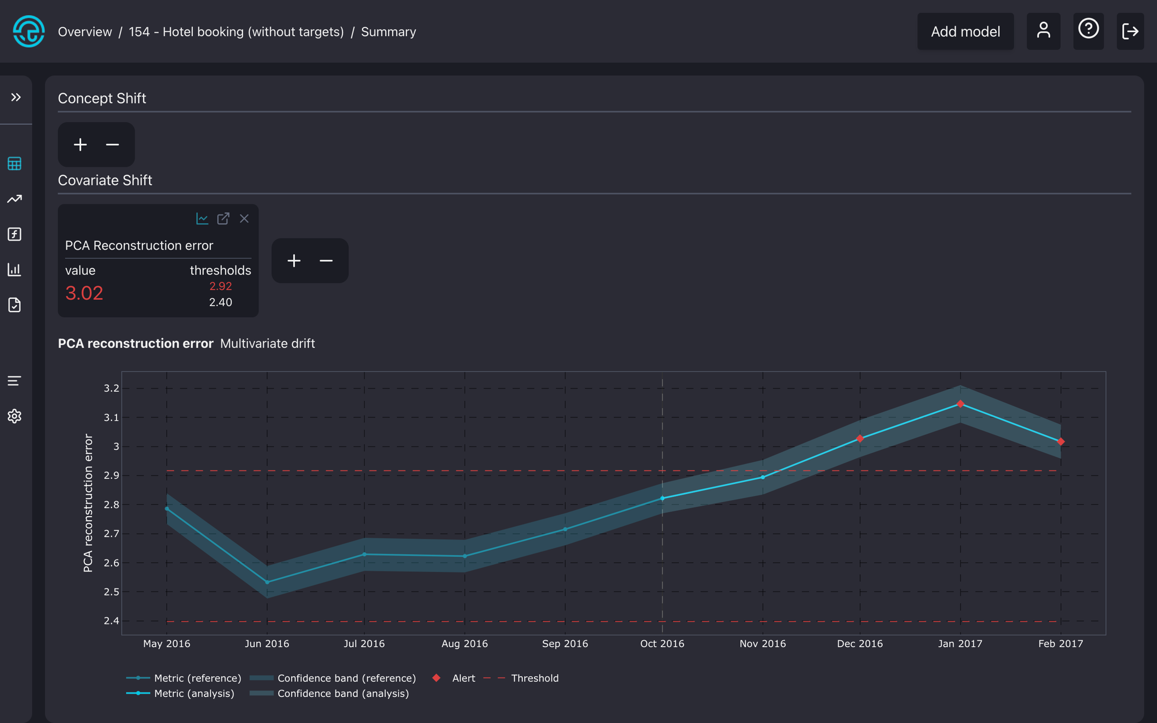 Also, the PCA reconstruction error from the multivariate drift detection method seems to be higher than the given thresholds.