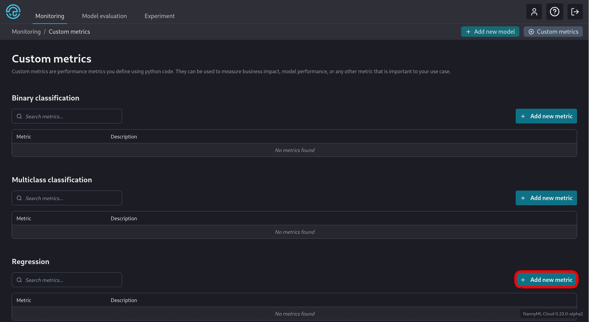 There are three types of custom metrics supported. Binary Classification, Multiclass Classification, and Regression. They are organized separately on the Custom Metrics settings page shown below: