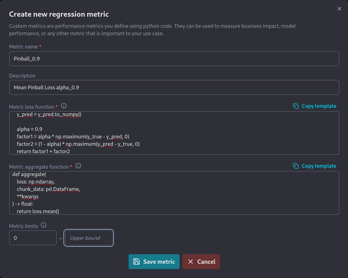 return loss.mean()The default metric limits still apply, so we can leave those as they are. These metric limits ensure that the metric thresholds are constrained to these theoretical limits.