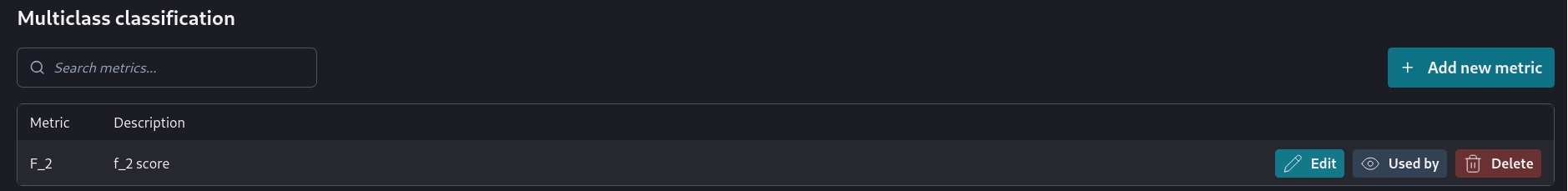 This results in the new metric now being visible in the Binary Classification section of the Custom Metrics screen.