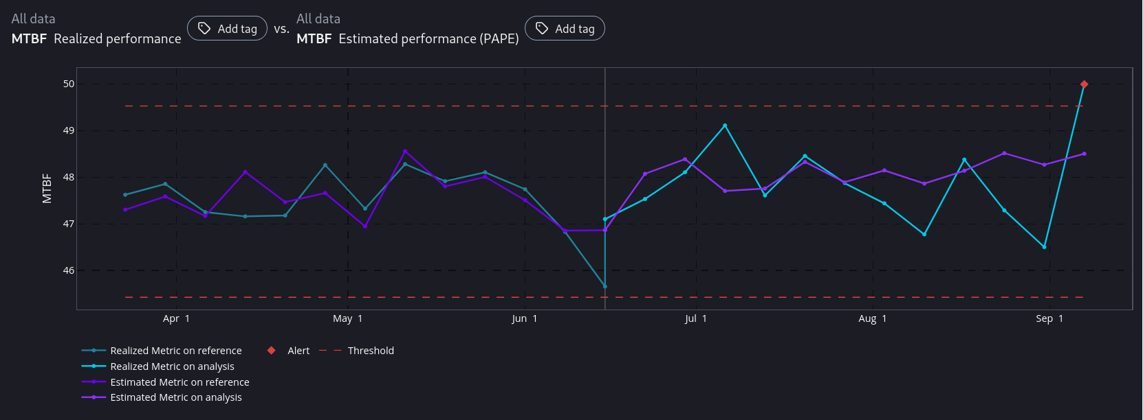 We can see that the values between estimated and realized `MTBF` score are very close. This means that we are likely estimating the metric correctly. The values will never match due to the statistical nature of the problem. Sampling error will always induce some differences.