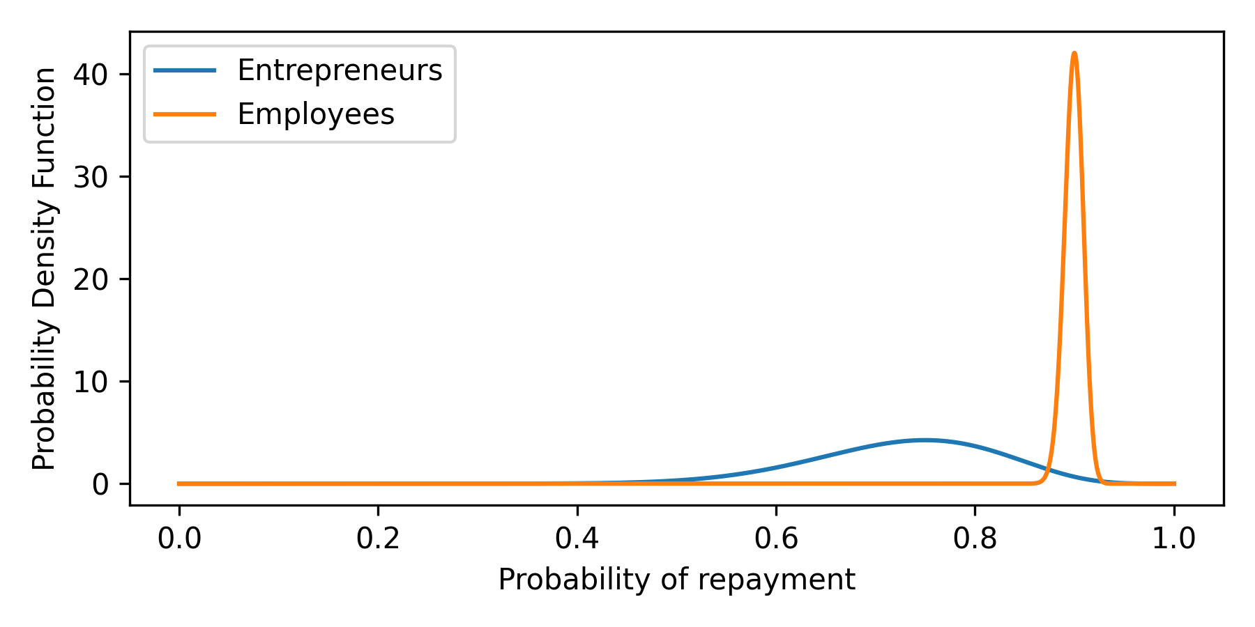 As expected - the new posterior is less precise (wider) as it accounts for more uncertainty. Notice how the left tail became heavier compared to the right tail. This is because we have more uncertainty for the calibration of entrepreneurs (the ones with a mean of 0.75 of repayment). The right tails became only slightly heavier - there's a lot of previous data on employees, and there's not much uncertainty around the calibration for this type of applicant.