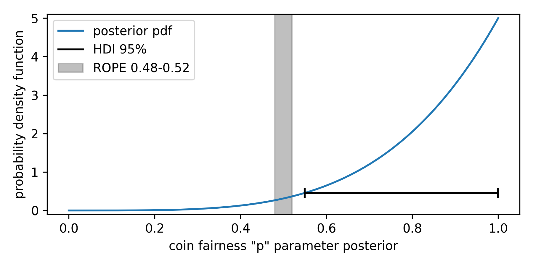 HDIs contain the required probability mass, usually 95 %. In this framework, if 95% HDI lies fully within the ROPE, we can accept the null hypothesis and claim that the coin is fair (given the prior data and the definition of fair coin we used). If it is outside - we can reject it. Suppose only part of HDI is inside the ROPE. In that case, we either say that the experiment is inconclusive (given the data observed), or we keep the experiment running, gather more data, and wait for HDI to fully get inside/outside ROPE. In some specific cases, though, we will never get a conclusive answer, regardless of the length of the experiment (that is, the amount of data). Figure 1 illustrates the described cases.