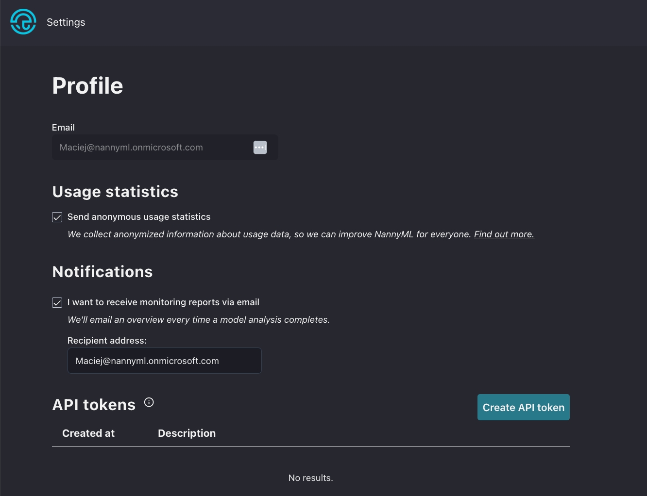 In account settings, you can opt out of anonymous usage statistics or set up a notifications system via email with reports. The API token section lets you create a token to authenticate when using nannyML Cloud SDK.