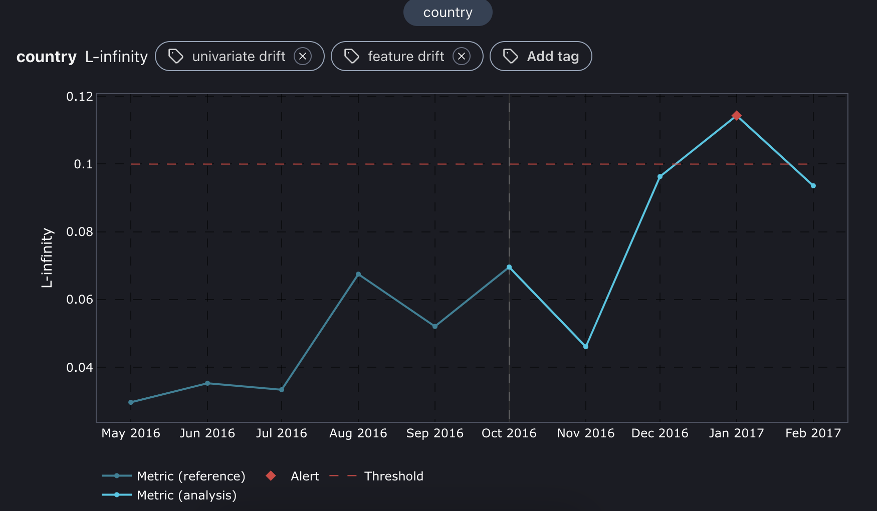 The charts are interactive, allowing you to hover over them for more details. Red dotted lines indicate the thresholds, while the blue line shows the metric during the reference period. The light blue line represents the metric during the analysis period.