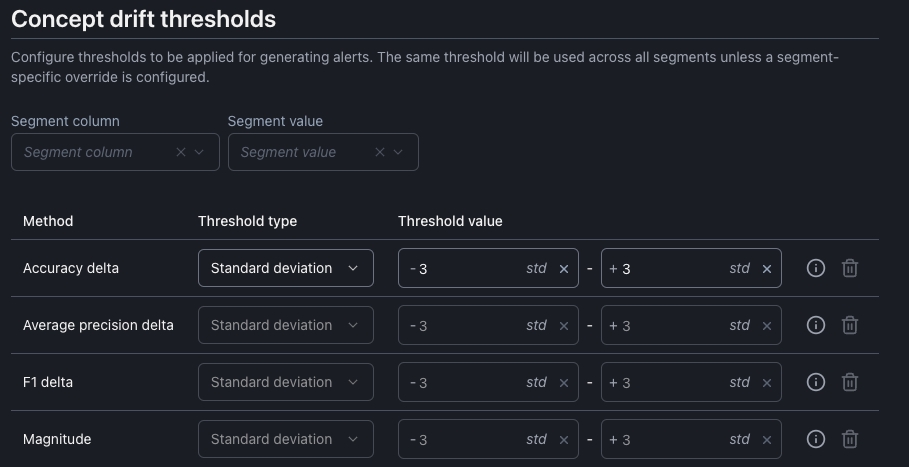 Each enabled metric allows you to set up a threshold for generating alerts for that metric. By default, the thresholds are applied across all segments unless specified otherwise.
