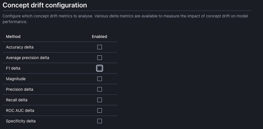 Here, you can specify which concept drift metrics NannyML Cloud will be analyzing.