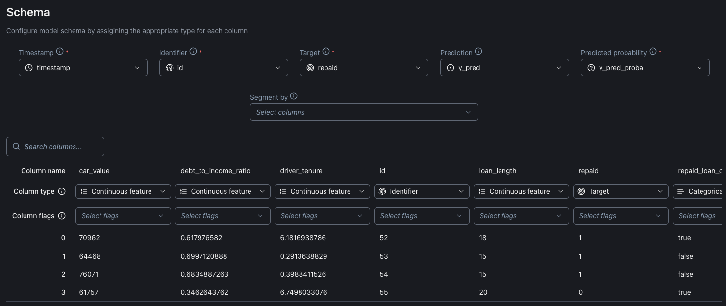 It is also possible to assign the columns on the schema dataset to the NannyML Cloud information directly from the table view.