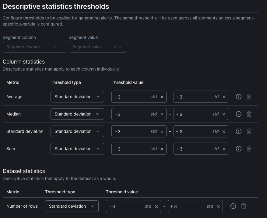 Here you can set up which descriptive statistics to analise. These are lightweight statistics that provide insight into the data distribution.