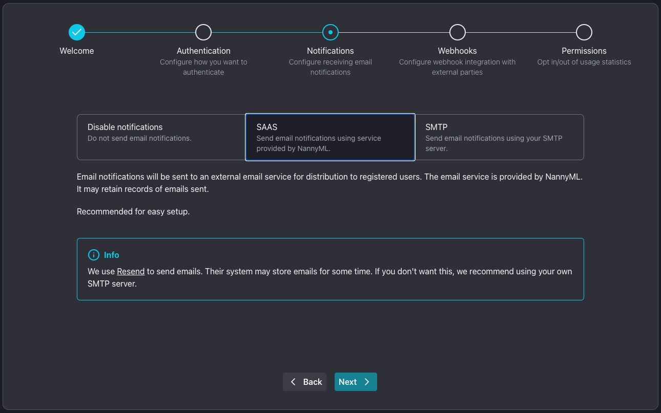 The SAAS option enables NannyML Cloud's preconfigured email provider. No further configuration is required.