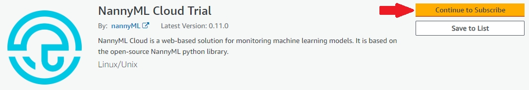 NannyML Cloud: NannyML Cloud using a contract license model. To subscribe you need to purchase a license in the AWS marketplace.