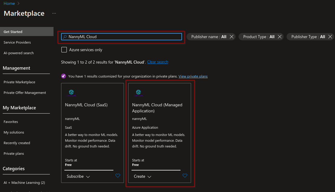 To deploy the NannyML Cloud managed application, we'll first have to find it in the Azure marketplace.