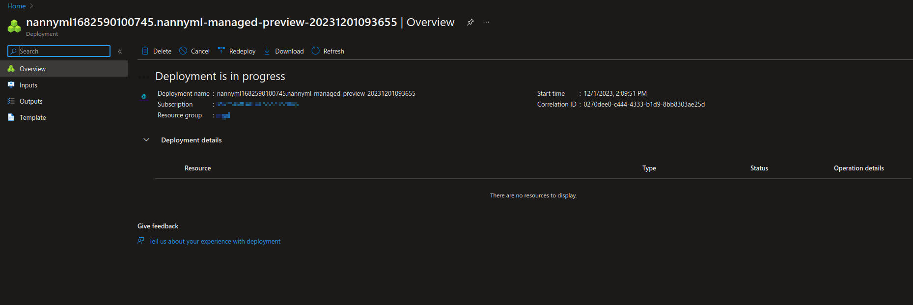 2. **Resource group**: select an existing or create a new resource group to house the managed application resource. The managed application itself will create two more resource groups to house the internal infrastructure. See the [engineering](https://docs.nannyml.com/cloud/v0.24.0/miscellaneous/engineering "mention") page for more details.