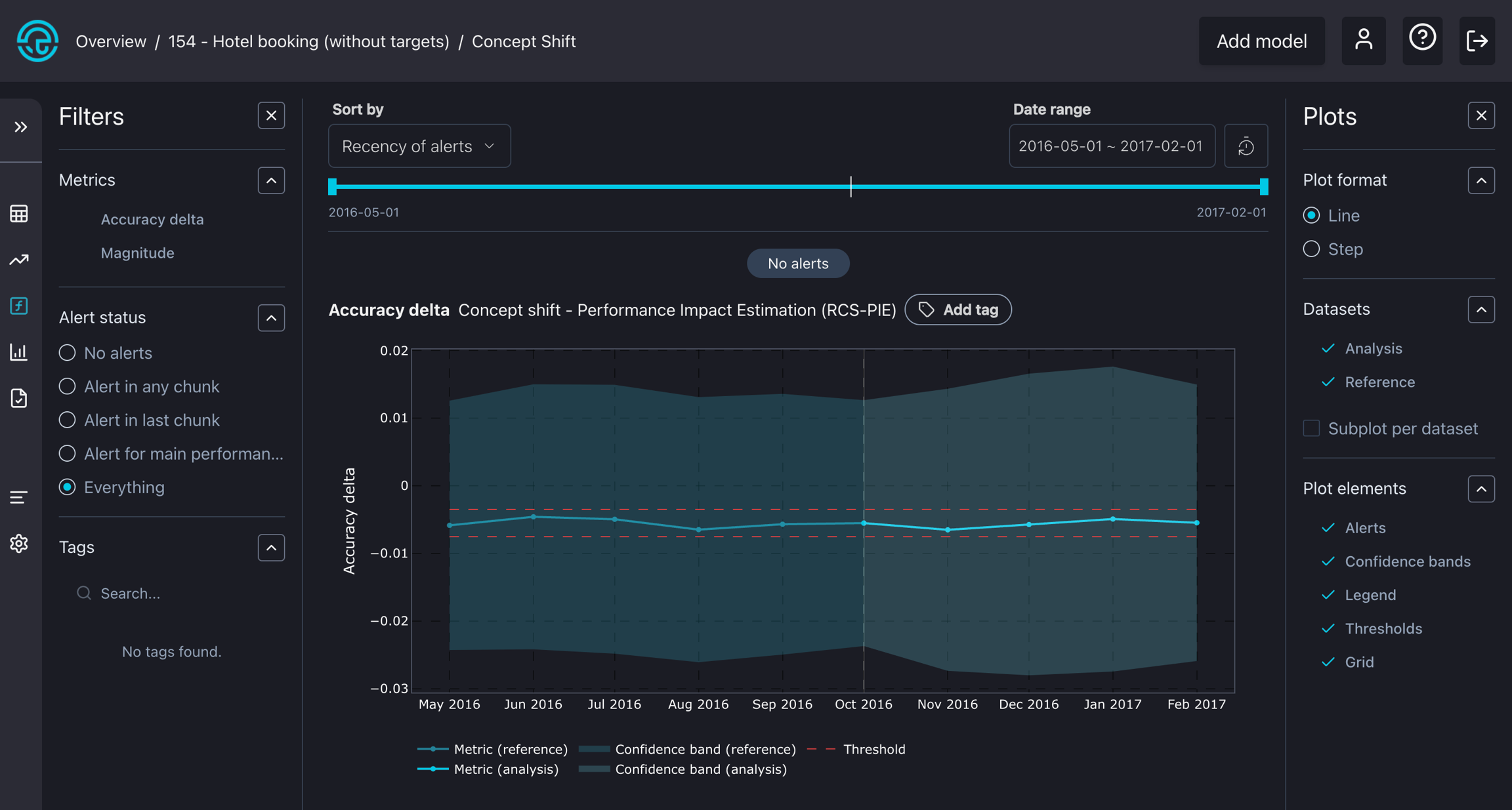 Then, we create a new model by using the Model.create() method. Where we can set chunk period to monthly, and accuracy as the main monitoring performance metric.