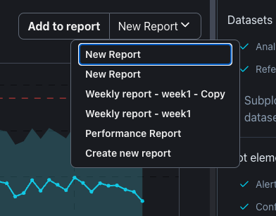 On the top right corner of each plot the user will find the Add to report button and the most recent report selected. Clicking on Add to report button will add the plot to the selected report. The user may select the desired report by clicking on the report name. The user can even create a new report by selecting the Create new report option.