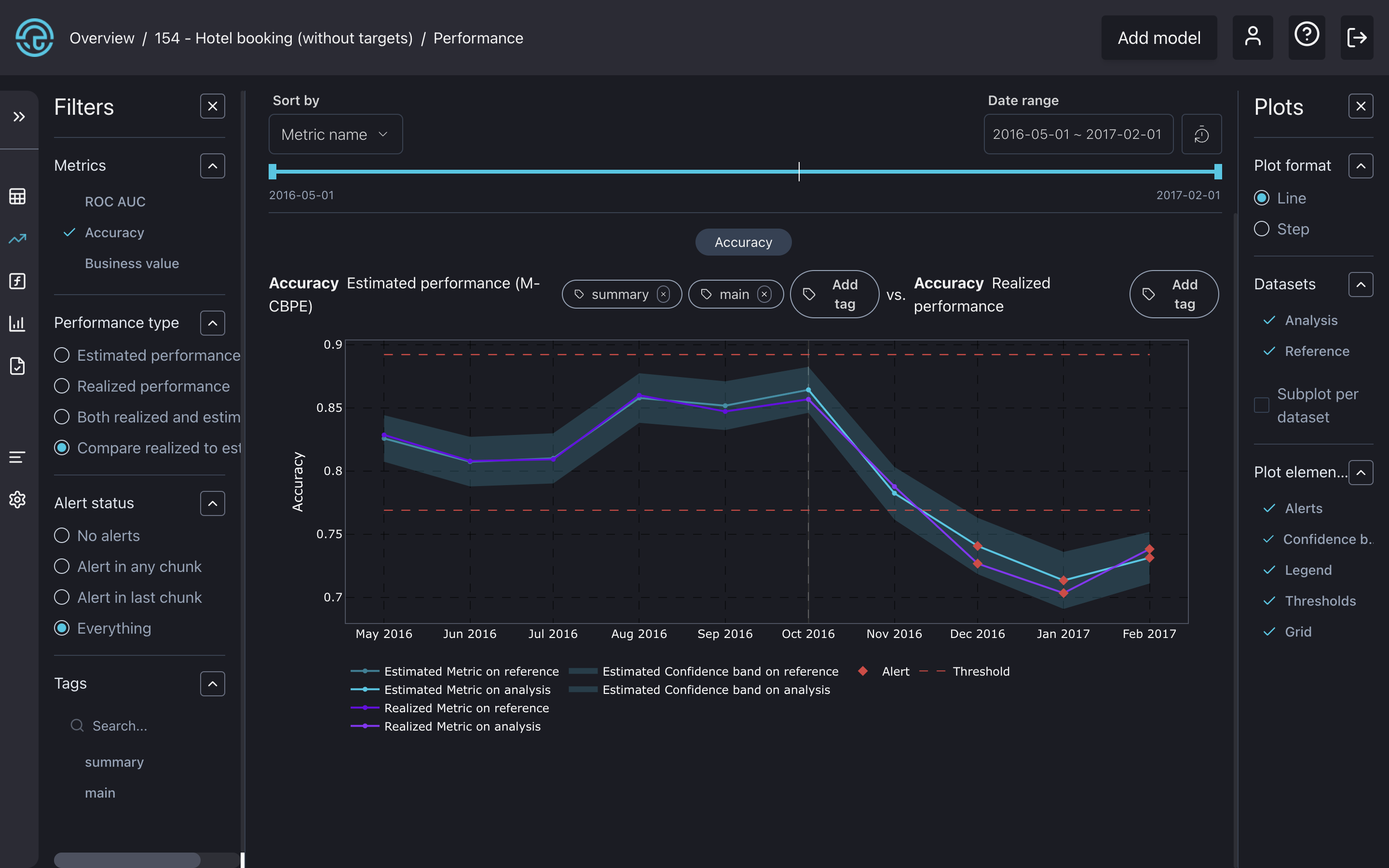 Let's see the estimated performance of our model on the summary page. The model summary shows signs of performance degradation in the last chunks of performance estimation.