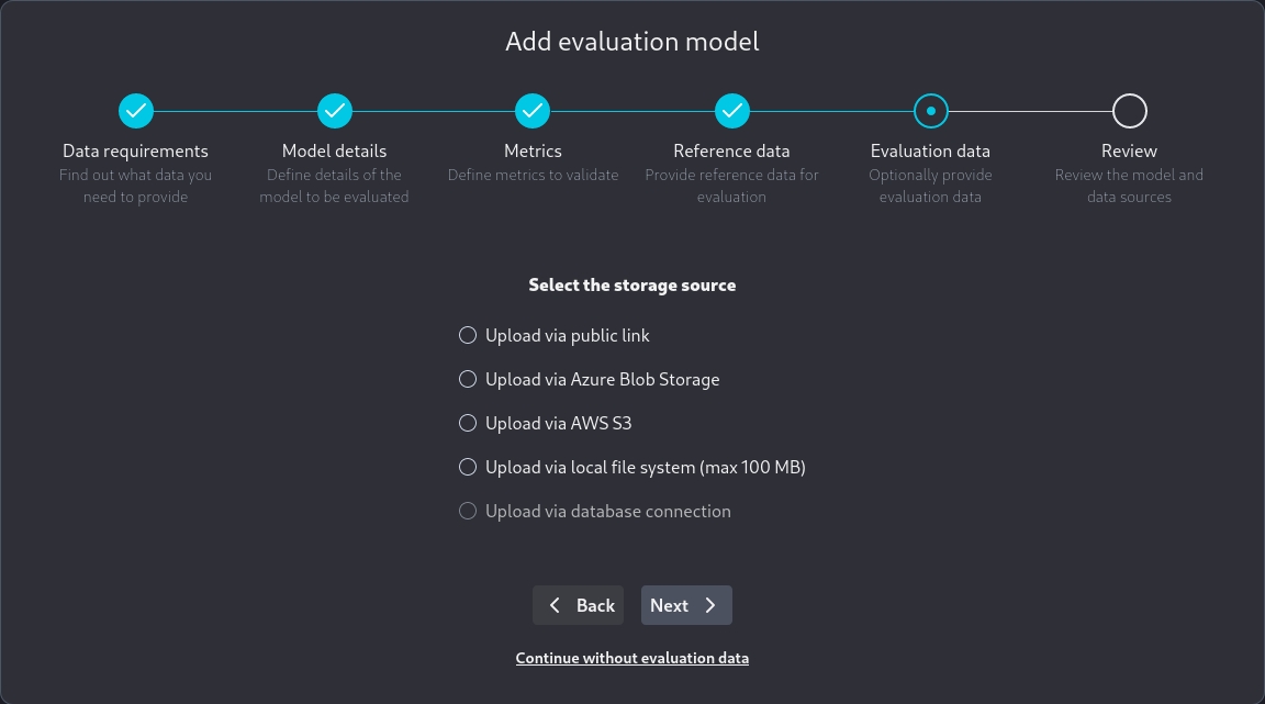 This step is optional. If evaluation data is not currently available, it can be provided later.