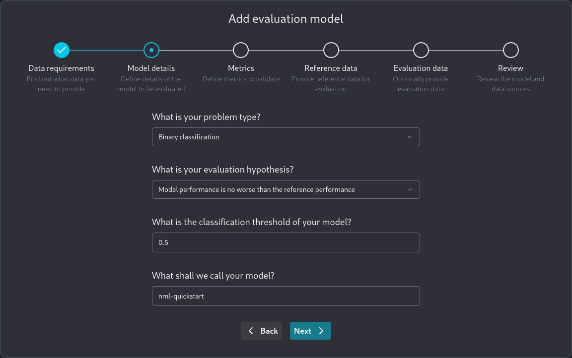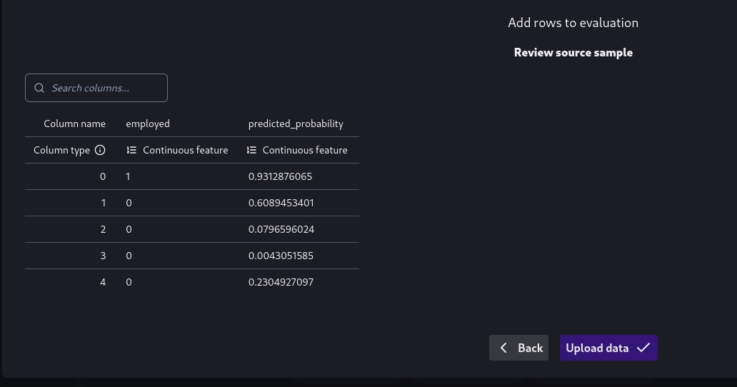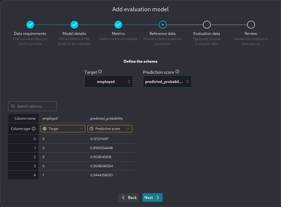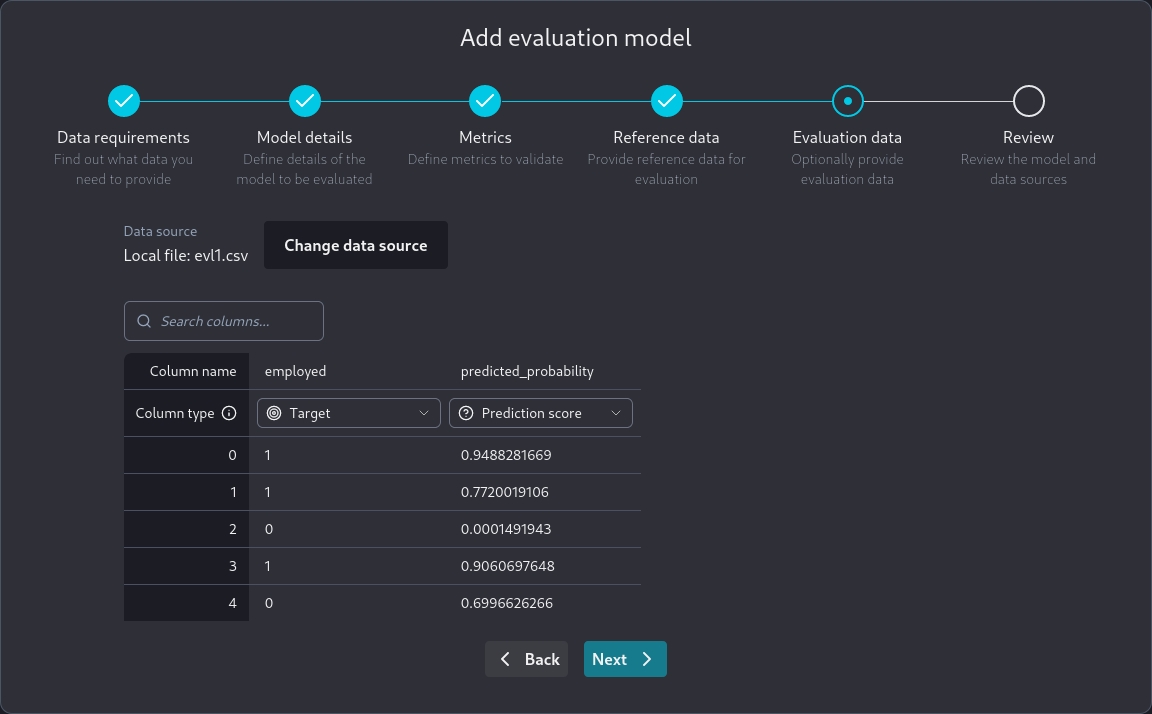 After providing the data we are again presented with a screen specifying their contents. Note that column names and data types cannot differ between reference and evaluation data.