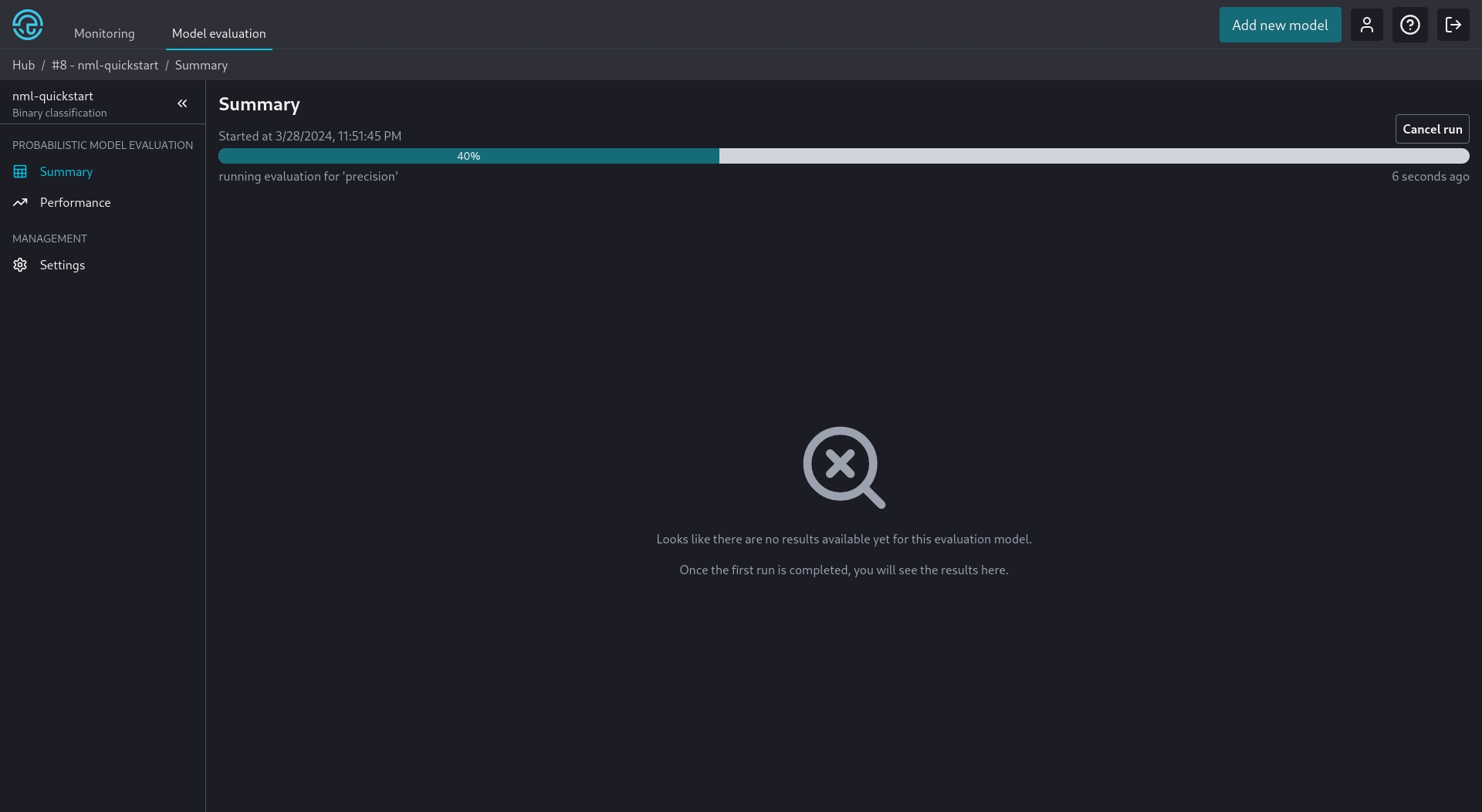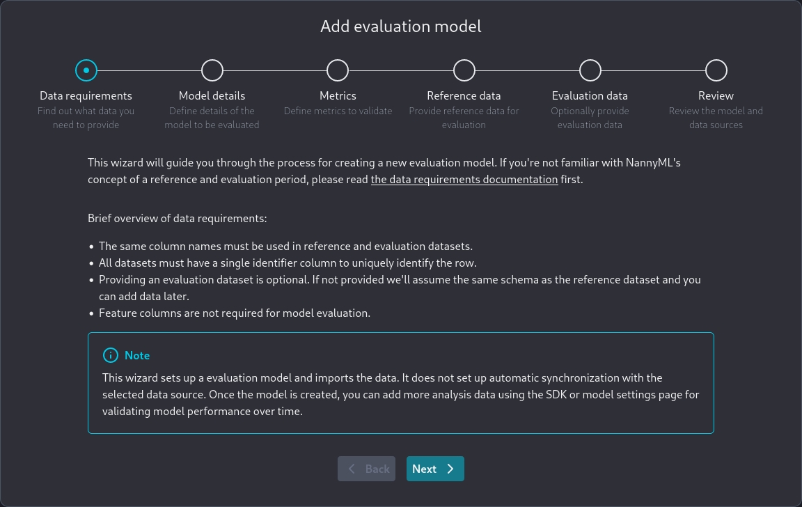 When viewing the Evaluation Hub page, the Add new model button initiates the wizard that guides you through adding a new model.