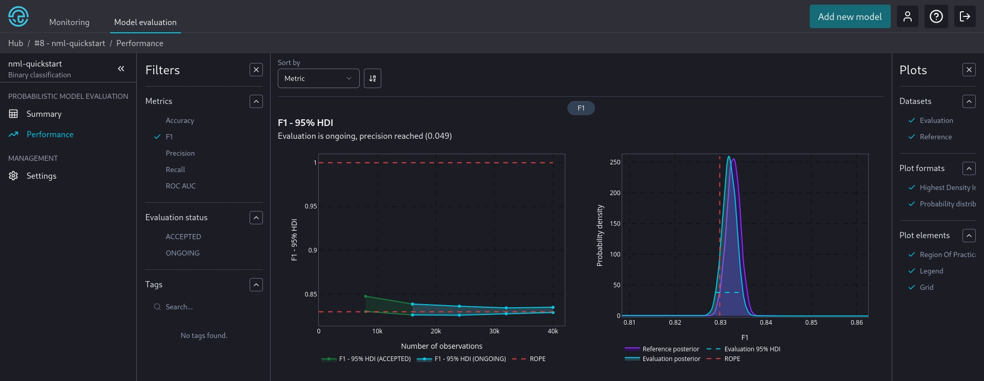 On the right side we see the reference posterior and the latest evaluation posterior for F1. Again, the ROPE area limits are shown as vertical red dash lines.