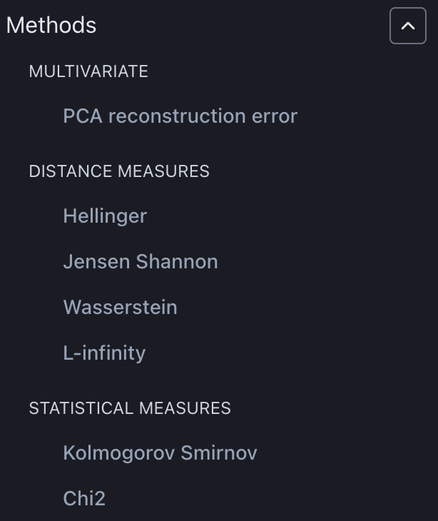 Select which drift methods you want to have results displayed for. Drift methods that are not calculated are not visible under the filter. Selecting which drift measures you want to have calculated can be done under model settings.