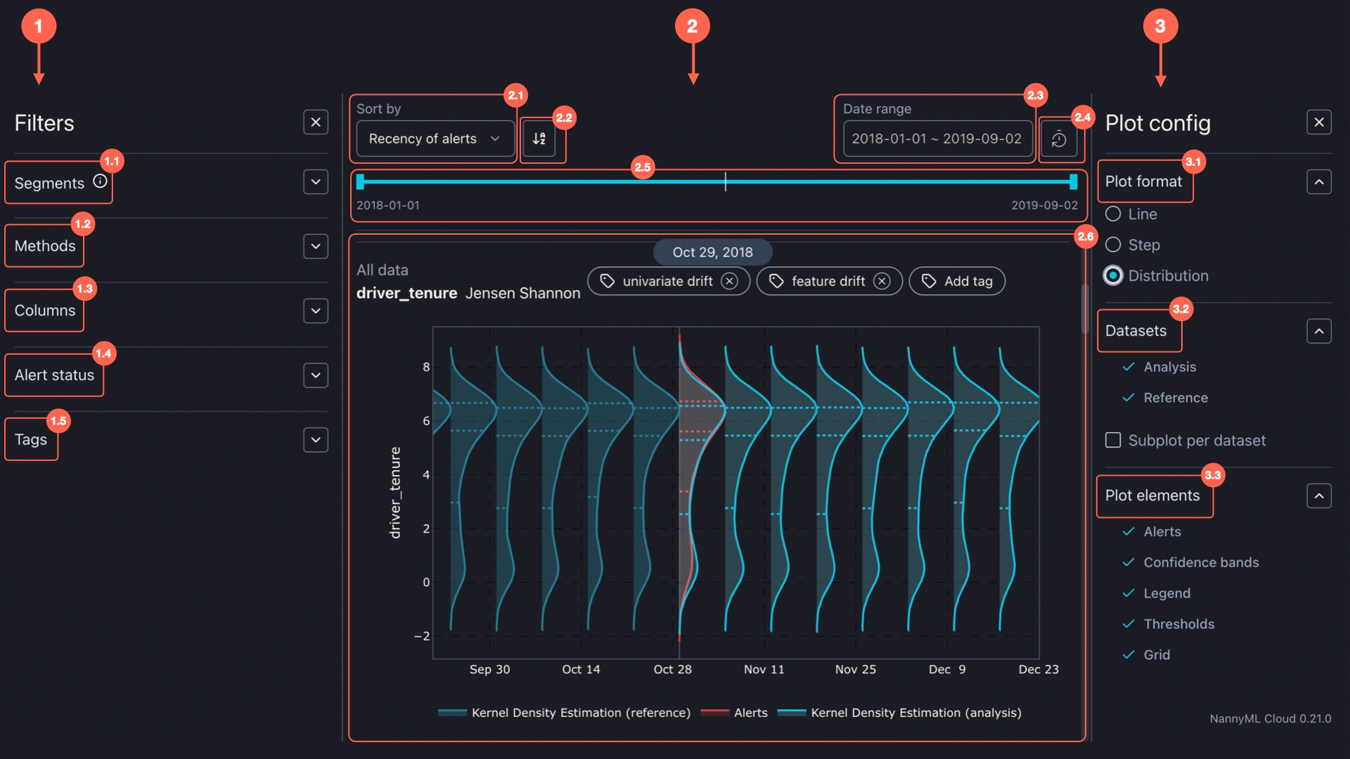 Filter charts for the columns you want to see. NannyML automatically identifies feature types such as targets, model outputs, and continuous and categorical features, making it easier for you to find the relevant ones.