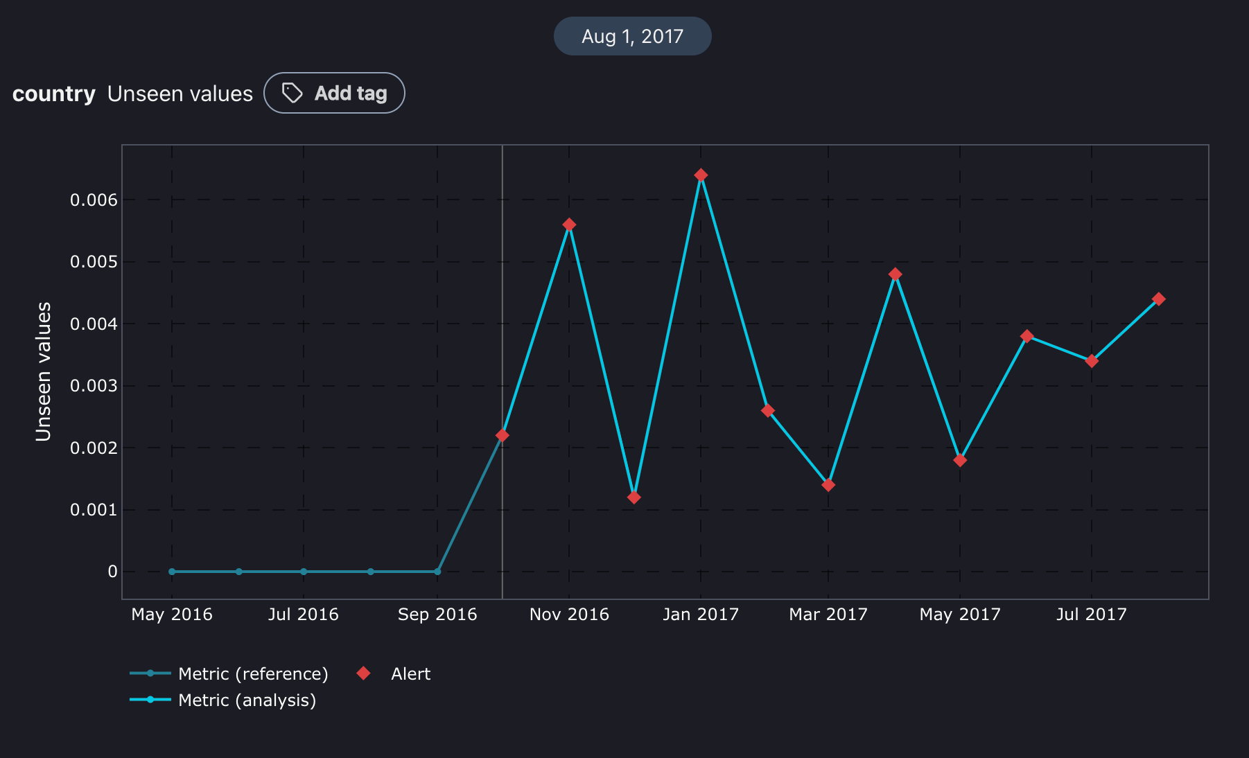 The data quality dashboard allows for analyzing the changes in missing and unseen values over time. Here is our guide explaining how to use the data quality dashboard: