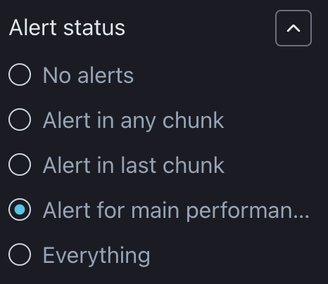 Choose which metrics to display based on whether there are no alerts, alerts in any or only the last chunk, alerts in performance metric with the main tag, or include all charts regardless of when and if any alerts occurred.