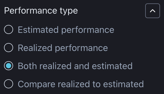 You can select which performance type you want to be displayed. The options include estimated performance, realized performance, and the comparison plot of realized vs estimated performance.