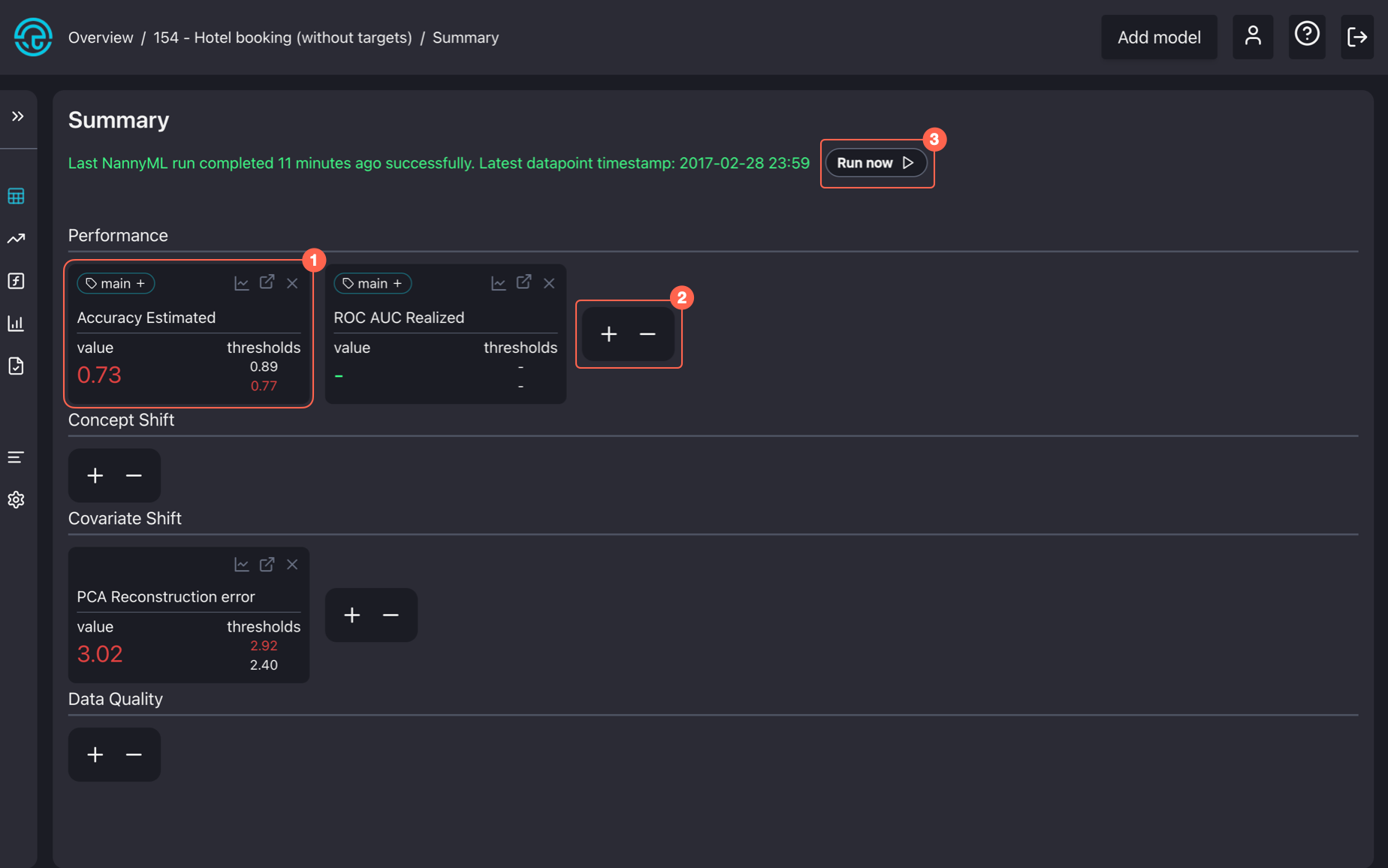 The first tab you can access in the side panel is the model summary page. It displays monitoring results for the most recent chunk for performance, concept shift, covariate shift, and data quality checks and notifies you whether there are any alerts.