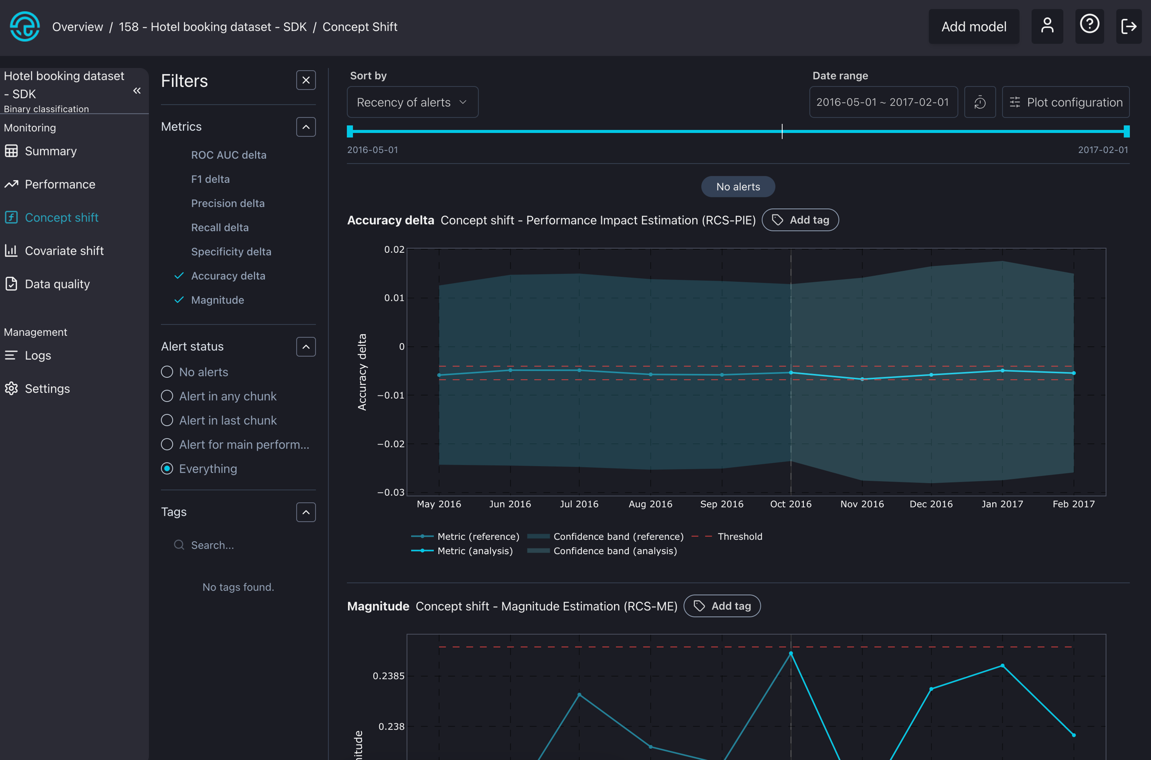 Measure the impact of Concept Drift on model performance: Our concept drift algorithms use the latest ground-truth data to validate if the performance change has been due to a change of concept.