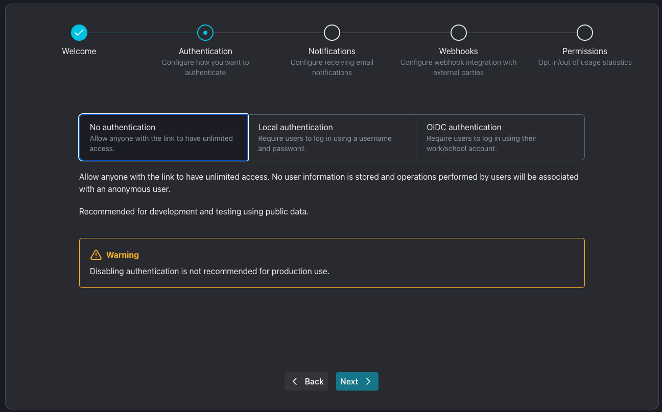 <figure><img src="https://content.gitbook.com/content/XHZtmbIWCoRBaGjIyKin/blobs/0FnJjzoPBojcYDgGQsrG/Screenshot%202024-07-08%20at%2016.42.10.png" alt=""><figcaption><p>No authentication allows anyone with an URL to access your NannyML instance</p></figcaption></figure>